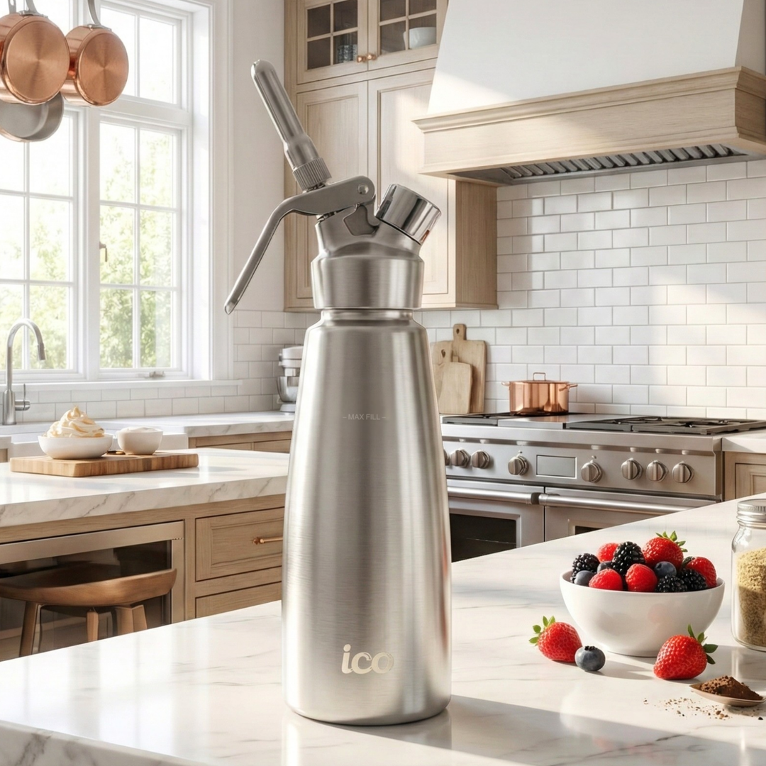 Professional high-quality whipped cream dispensers made from TUV certified Aluminum or Stainless Steel in two different sizes (1 Pint or 1 Quart).